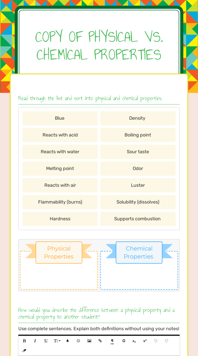 Physical Vs Chemical Properties Worksheet : Chemical Properties Chemistry Properties Recall That Physical Properties Can Be Observed Without Producing New Substances Chemical Properties Describe Course Hero :. Interactive practice on physical vs. Physical changes usually occur when heat (energy) is either added or taken away. For example, color, shape, mass, length, density, specific heat and odor are all examples of physical properties. Physical & chemical properties online worksheet for 10. Classify the following as being a physical or chemical change.